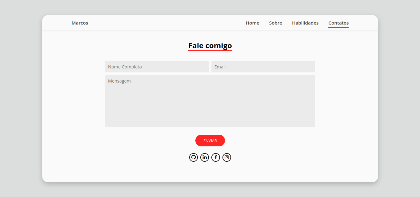 Seção para contatos, contendo um form com nome, email e mensagem que se deseja mandar ao usuário do portfólio. Além disso, ao final, estão ícones para os meios de contato: GitHub, LinkedIn, Facebook e Instagram.